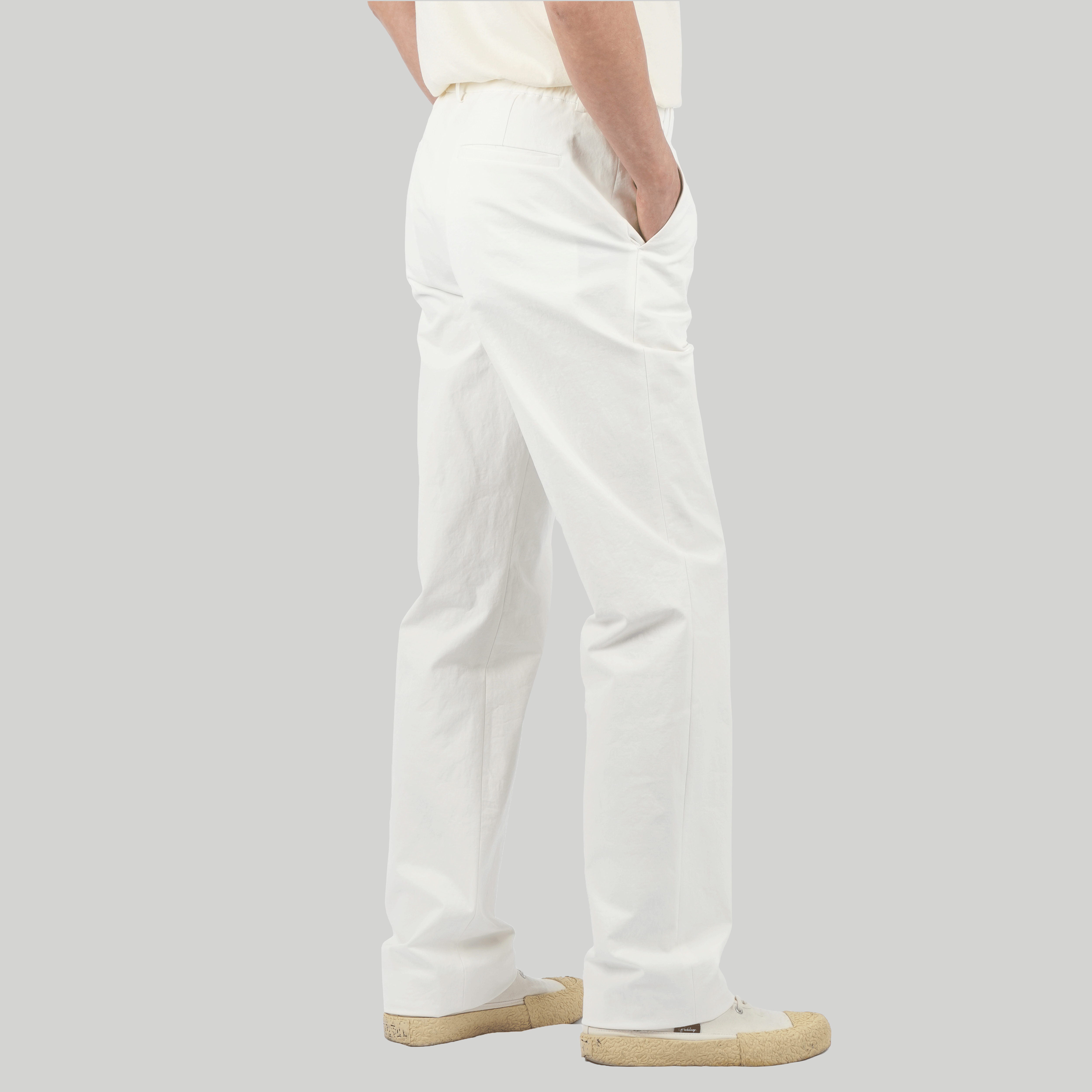 편안한 허리밴딩 스타일, 면바지의 편안함과 스판의 신축성으로 장시간 착용에도 부담 없음.